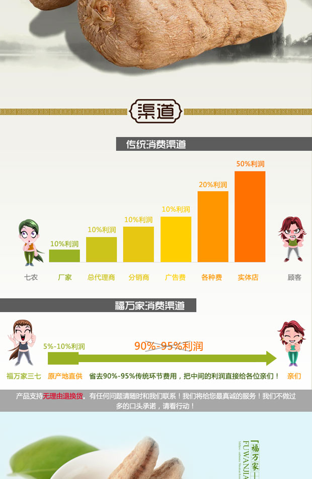 您的擔心是很必要的!要知道,網上買都存在風險,但我們文山福萬家是對客戶長期維護的,服務是有口皆碑的,雖然我們暫時不是什么大公司,但是我們將一直發展下去,因為這既是我們的生存之道,也是對老客戶的責任。關于產品,發貨都是從我們文山本地發的,三七都保證是不帶剪口不打蠟的足干本色水洗春七,重點是不帶剪口,一般您在市場上是買不到這么好的三七的。包裝上都有我們福萬家的品牌標識地址電話,不是市面上的那種三無產品。除了品牌品質保證,還給您承諾30天無理由退款退換貨保證。